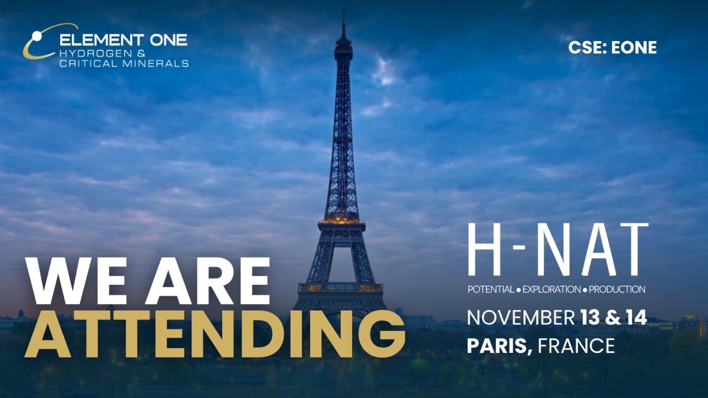 Element One Hydrogen will attend the H-NAT Natural Hydrogen Summit 2025 in Paris on November 13-14, joining global leaders in the emerging natural hydrogen industry to discuss exploration, technology, and investment opportunities. The event brings together scientists, regulators, and companies driving innovation in geologic hydrogen. Element One looks forward to engaging with key stakeholders and advancing collaboration toward the commercialization of natural hydrogen.