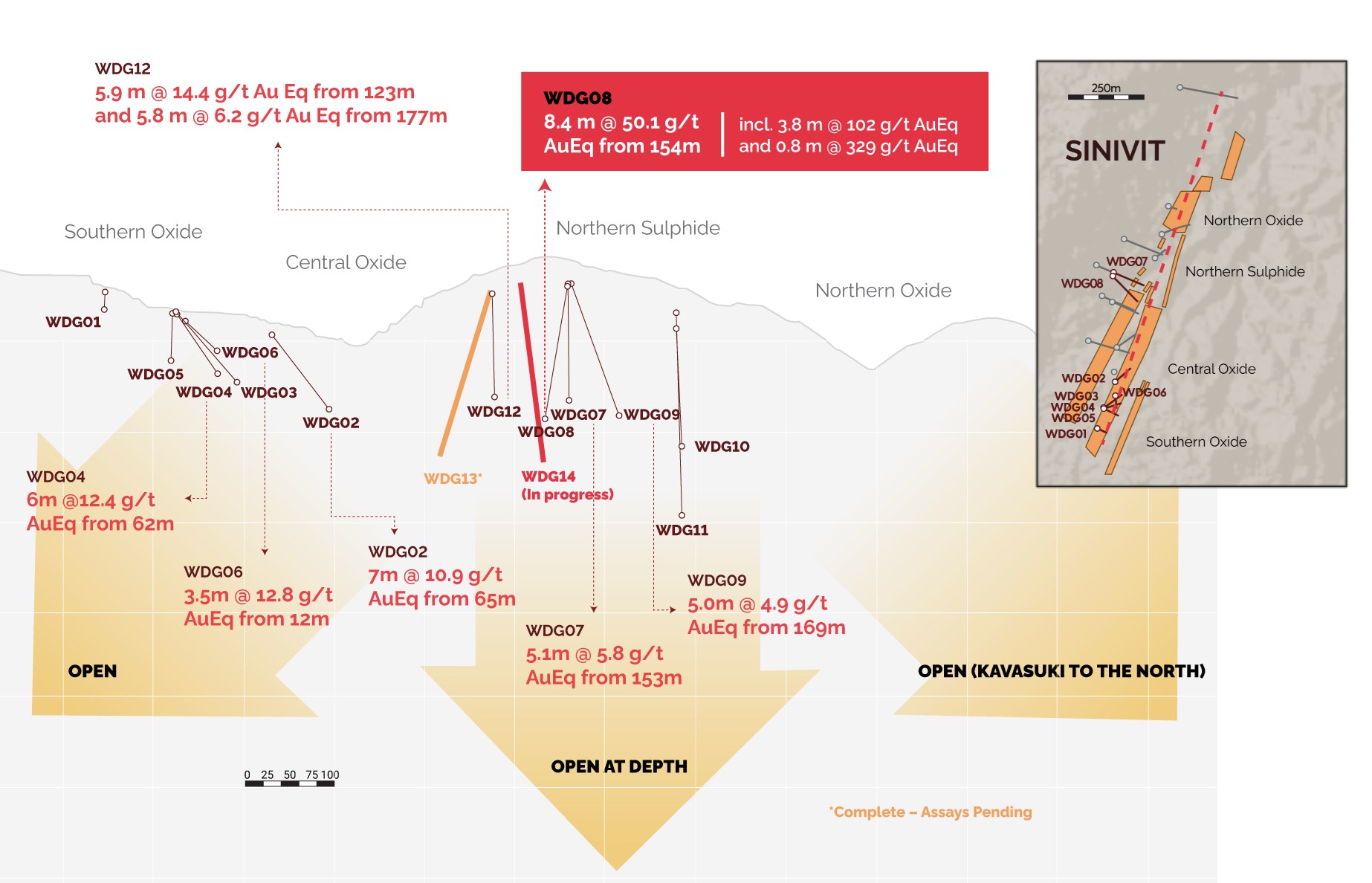 "The Sinivit target on the Wild Dog epithermal structural corridor continues to deliver high-grade results. In addition, we are starting to build an advanced understanding of the structural controls for mineralization at Sinivit. Holes WDG-08, 12 and 13 define a coherent high-grade pod within the broader Sinivit structure, with WDG-14 underway and continuing to test this area. Mineralization beneath the Northern Oxide area (10, 10A and 11) appears weaker, consistent with our current model and historical results. This variation is typical of epithermal systems near surface," stated Greg McCunn, CEO of GPAC.