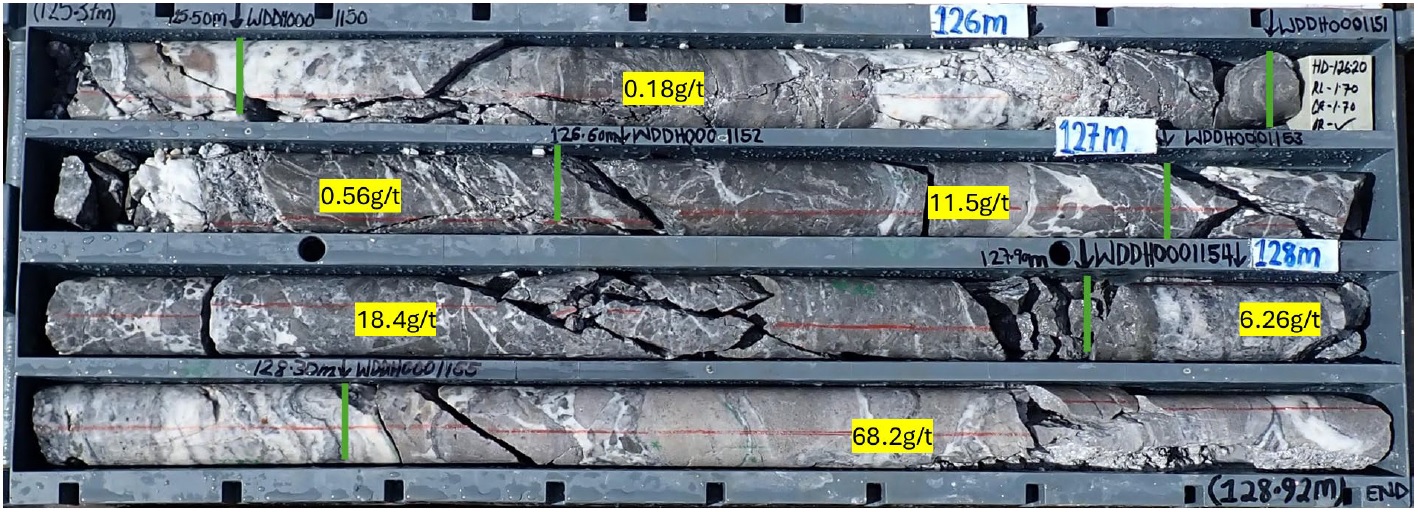 Figure 1: WDG-12 core from 125.37-128.92m (Zone 1) showing high-grade quartz-sulphide veins and gold grades up to 68.2 g/t Au.