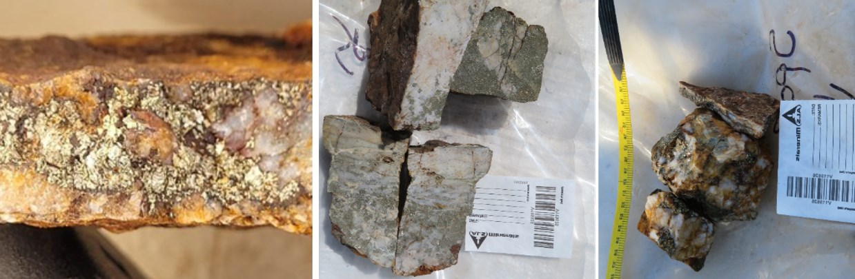 The middle sample yielded 8.99 g/t Au and 32.3 g/t Ag with 1.39 % Cu, and the sample on the right