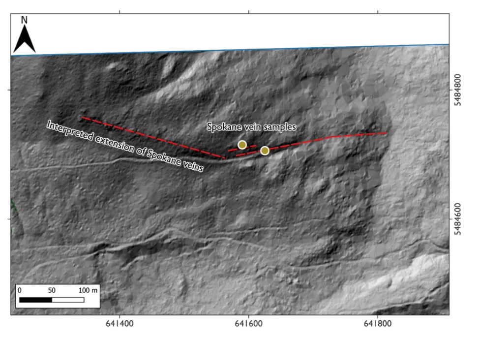 The orientation of the Spokane vein remains undefined, but the grab samples align with an east-west lineament identified from high-resolution LiDAR data acquired in 2022. Based on this interpretation, the vein has a potential strike length of 500 meters (see map below). This indicates excellent discovery potential in this area.