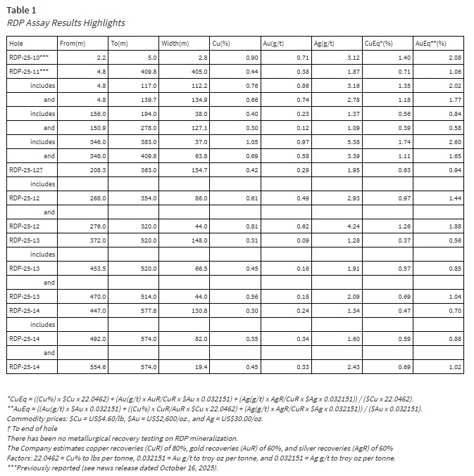 - Drill holes RDP-25-012 and RDP-25-013 confirmed the elongate and tabular nature of mineralization between intersections in RDP-22-005, which returned 107.2 m of 1.39% CuEq* or 2.06 g/t AuEq** (0.63% copper, 1.10 g/t gold, and 2.91 g/t silver) (see news release dated October 25, 2022), and RDP-23-007, collared 240 m to the northeast of RDP-22-005, which ended in 19.0 m of 0.45% CuEq* or 0.67 g/t AuEq** (0.32% copper, 0.19 g/t gold, and 1.08 g/t silver) (See news release dated November 23, 2023)(See Figure 3).