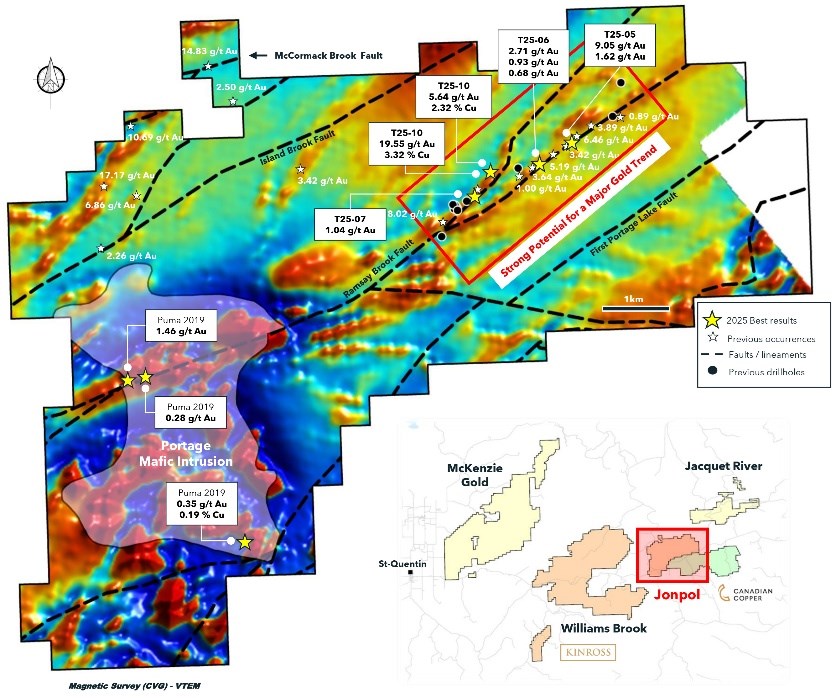 Puma's 2025 surface sampling on the Jonpol Property revealed high-grade gold and copper, especially along the Ramsay Brook Fault, indicating a potential 2 km gold-bearing trend.