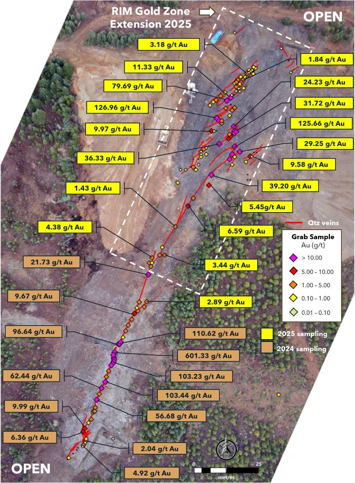 Puma's 2025 summer trenching and stripping program successfully extended the RIM Gold Zone by an additional 100 metres along strike, nearly doubling its previously known length. In the northern section of the newly stripped zone, the vein system spans 35 metres in width (Figure 2). Importantly, the RIM gold vein system remains open in all directions. The presence of visible gold ("VG") in several locations across the newly exposed sections highlights the high-grade character of the vein system (Picture 1).