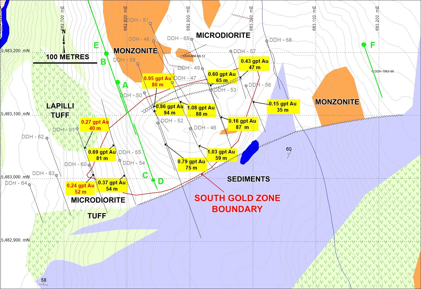 Four holes that total ~470 metres are planned to confirm the continuity of gold mineralization in the 80 m gap between sections on the attached map of the South Gold Zone, collect specific gravity measurements of drill core and elevate the Gold Zone into an NI 43-101 resource "possible" category (Figure 1, collars A to D).