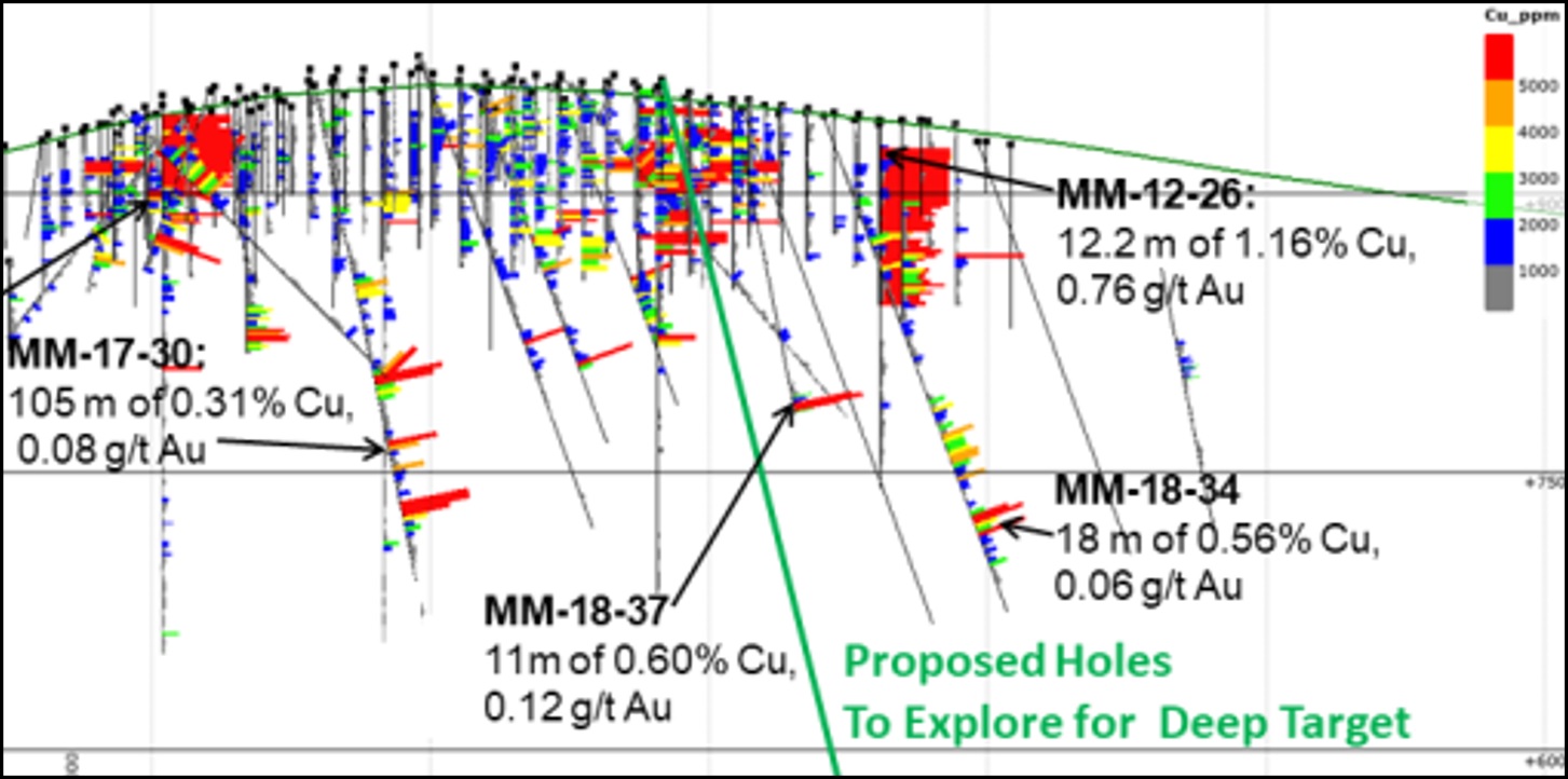 A diamond drill hole will explore ~500 m depths below a +1% copper porphyry intersection shown in a long section in Figure 2.