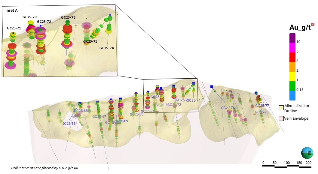 - Hole GC25-72 intersected 53.4m of 1.44 g/t Au, and Hole GC25-79 intersected 28.9m of 2.65 g/t Au on opposite sides of the same section, suggesting the mineralized zone is wider than previously thought.