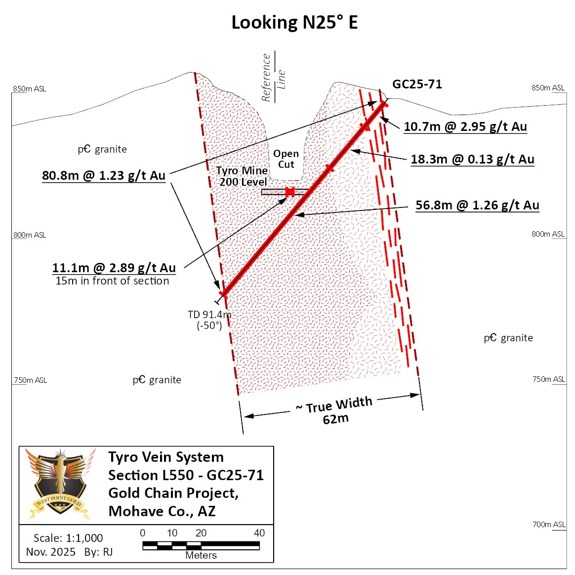 Hole GC25-71 was drilled on Line 550 and was designed to test the Tyro Main zone adjacent to and immediately below the pit (Figure 1); it also tested the vein system immediately below the Tyro 200 Level, where sampling revealed 11.1m of 2.89 g/t Au along a nearby crosscut (Figure 3). Owing to the inaccessibility to sample the pit's 'high walls', Hole GC25-71 provides important data in the definition of the near-surface gold mineralization. The hole traversed (1.52m to 82.3m) 80.8m of 1.23 g/t Au (Figure 3) hosted by quartz-chalcedony veins and veinlets.