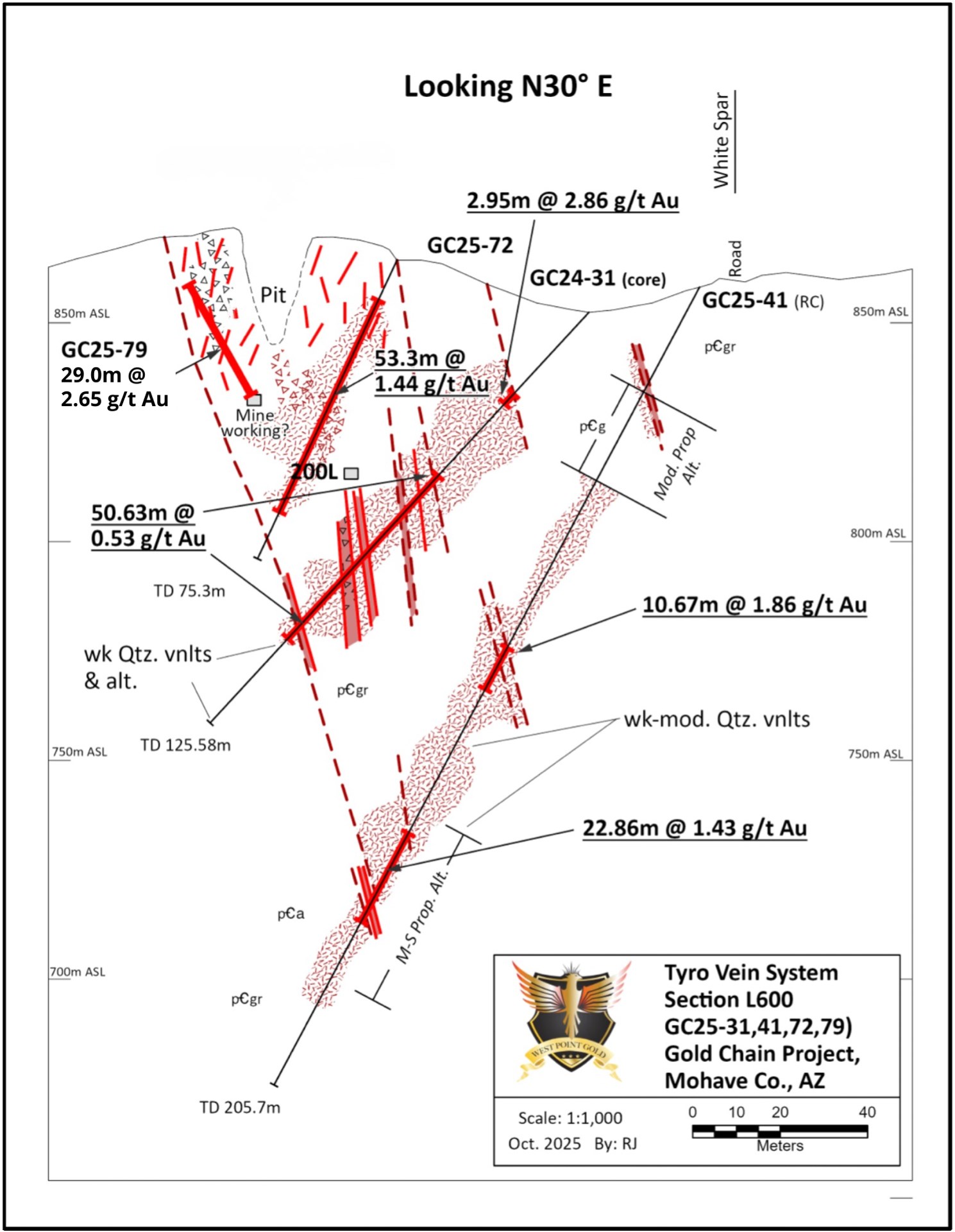 Vancouver, British Columbia--(Newsfile Corp. - November 12, 2025) - West Point Gold Corp. (TSXV: WPG) (OTCQB: WPGCF) (FSE: LRA0) ("West Point Gold" or the "Company") announces the remaining drill results from its shallow program, the initial phase of the 10,000 metre (m) drill program at its flagship Gold Chain Project in Arizona. The Company is reporting assay results for 6 drill holes, GC25-71 to GC25-75 and GC25-79, representing 471m.